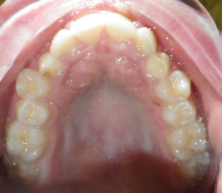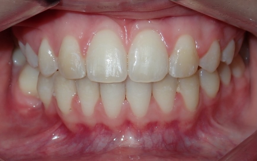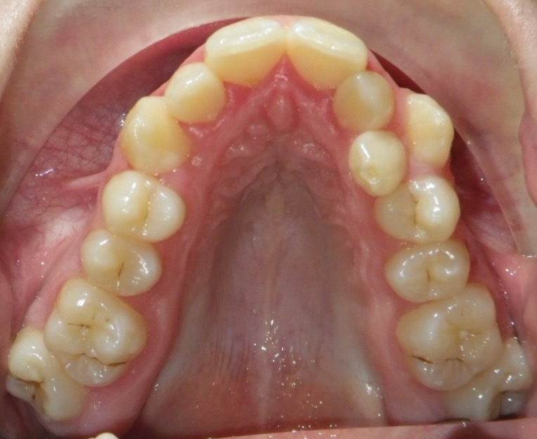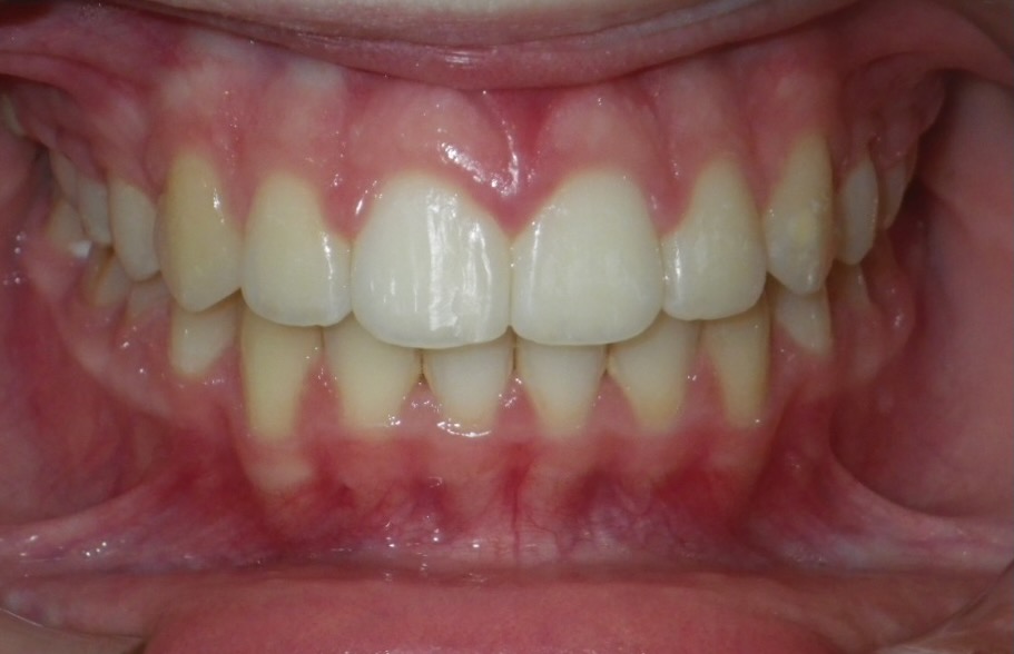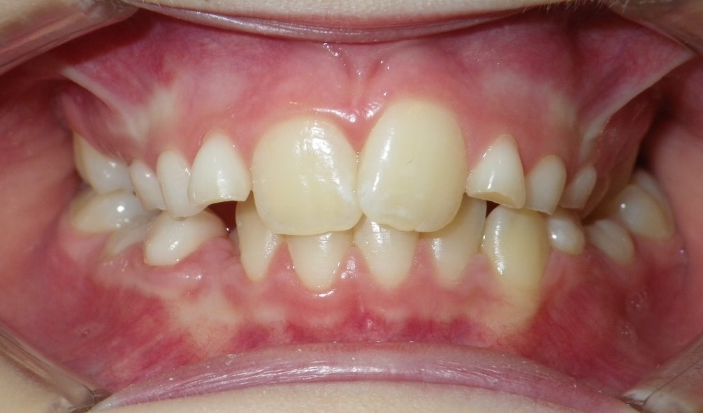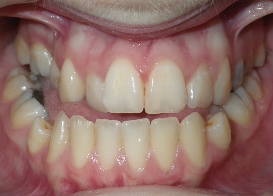 8-year-old girl who was treated with a Rapid Maxillary Expander to correct a narrow upper arch and a cross-bite caused by a thumb-sucking habit. The expander was also used to help break the thumb-sucking habit. This was followed by upper and lower fixed braces in her early teens to fully align her teeth. The treatment was carried out in two phases: the first phase took approximately 6 months, and the second phase lasted 15 months.