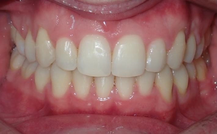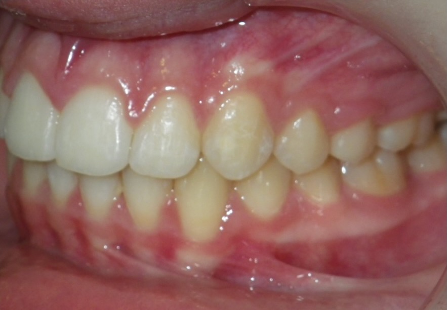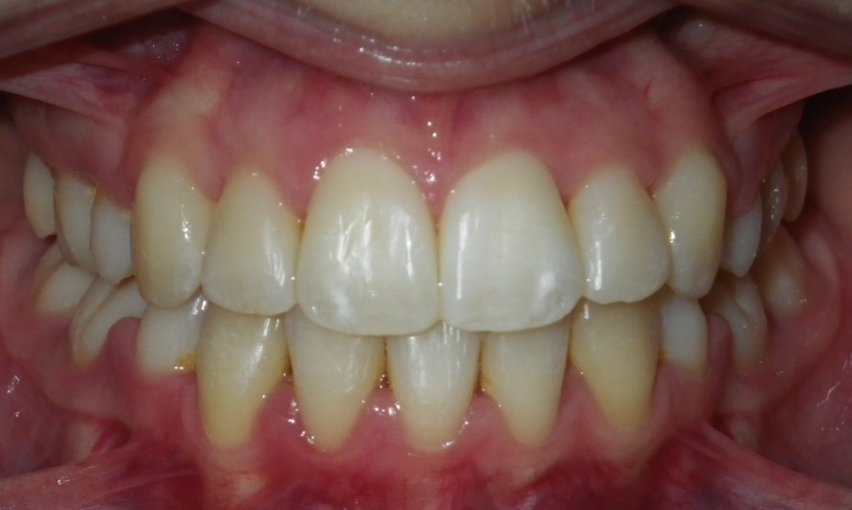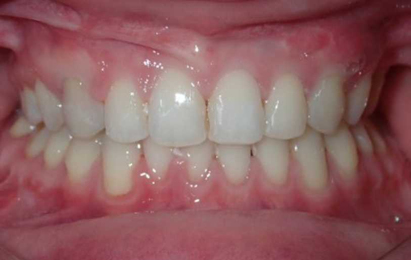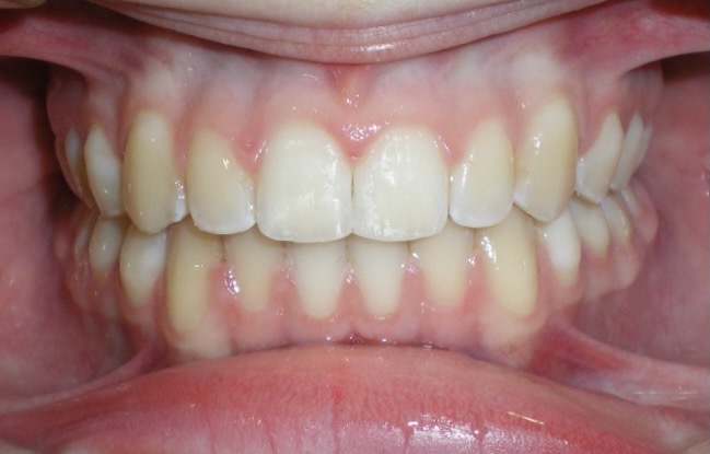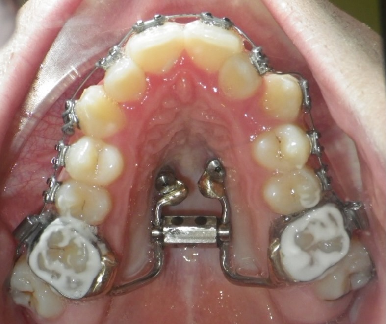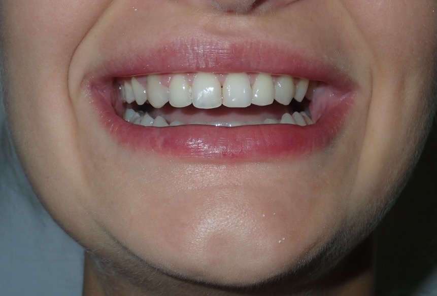 8-year-old girl who was treated with a Rapid Maxillary Expander to correct a narrow upper arch and a cross-bite caused by a thumb-sucking habit. The expander was also used to help break the thumb-sucking habit. This was followed by upper and lower fixed braces in her early teens to fully align her teeth. The treatment was carried out in two phases: the first phase took approximately 6 months, and the second phase lasted 15 months.