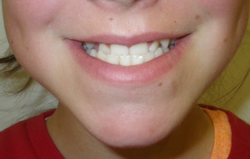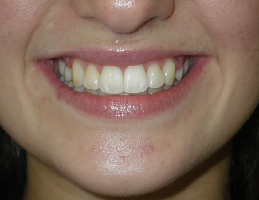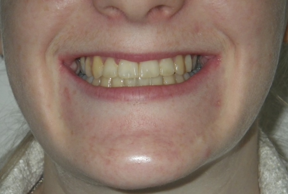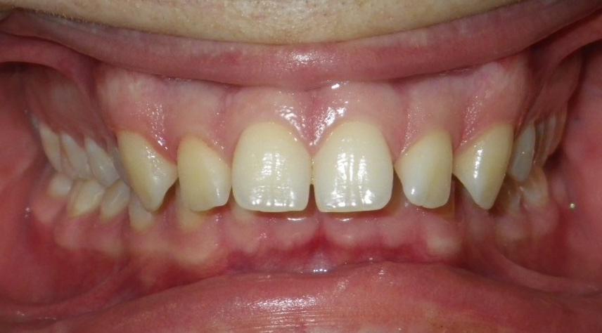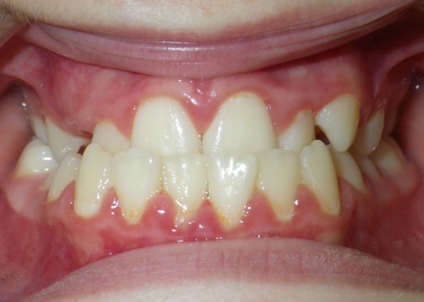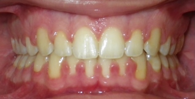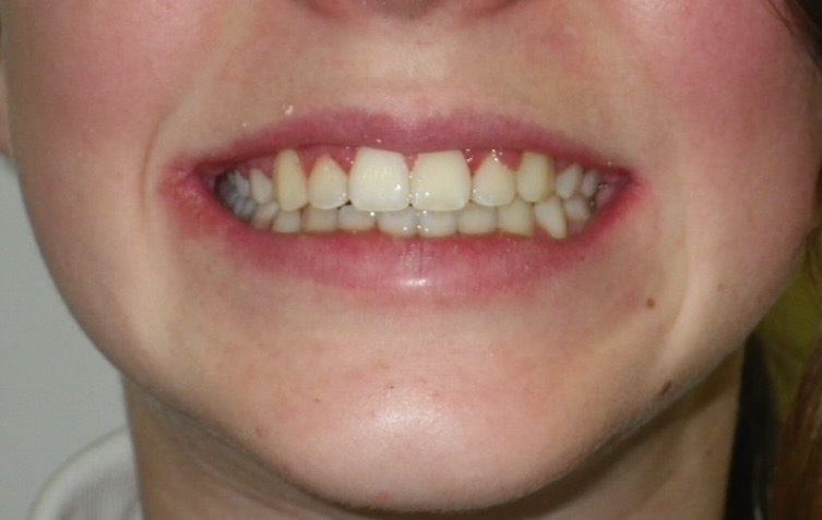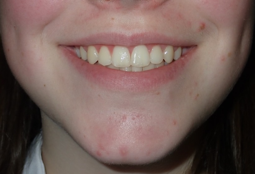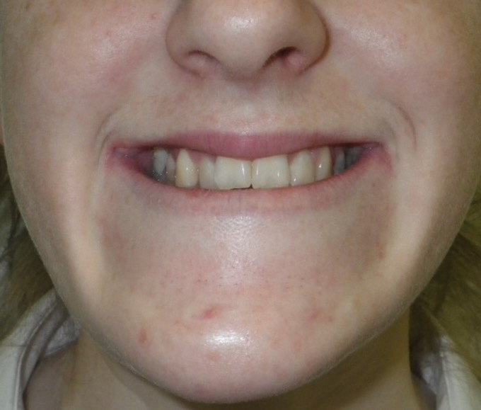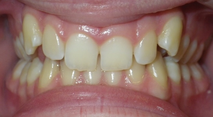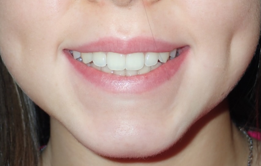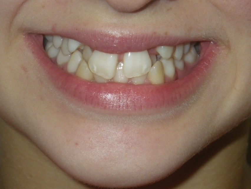 11 year old girl treated with expansion of the top jaw and upper and lower fixed braces. The treatment aimed to bring the upper canine teeth into the lateral incisor position due to congenitally missing upper lateral incisors. The upper canines were then masked to resemble upper lateral incisors. The total treatment time was 26 months.