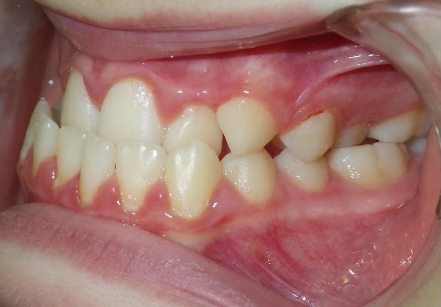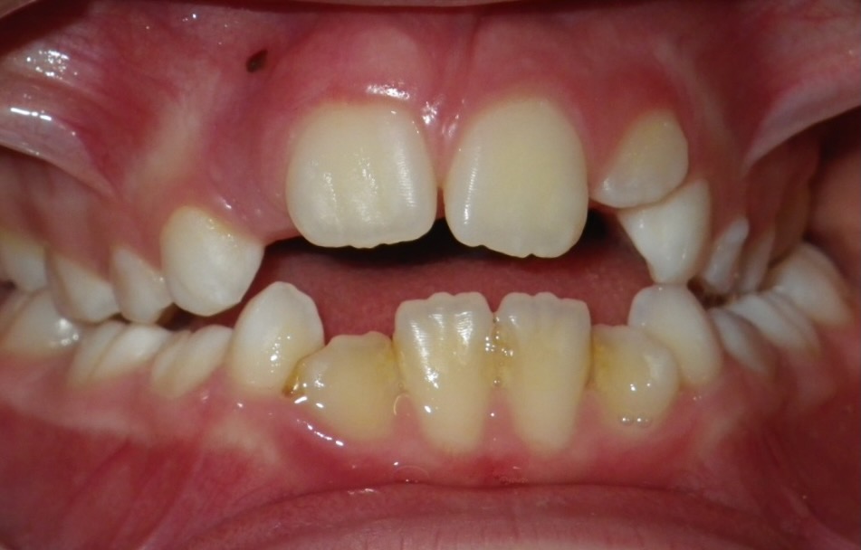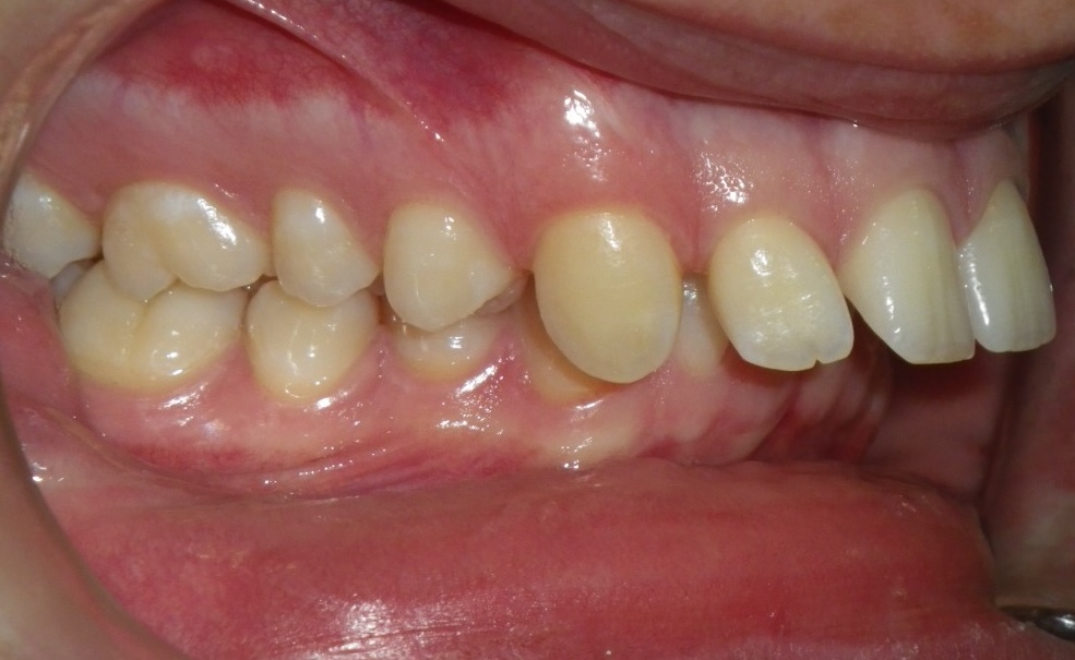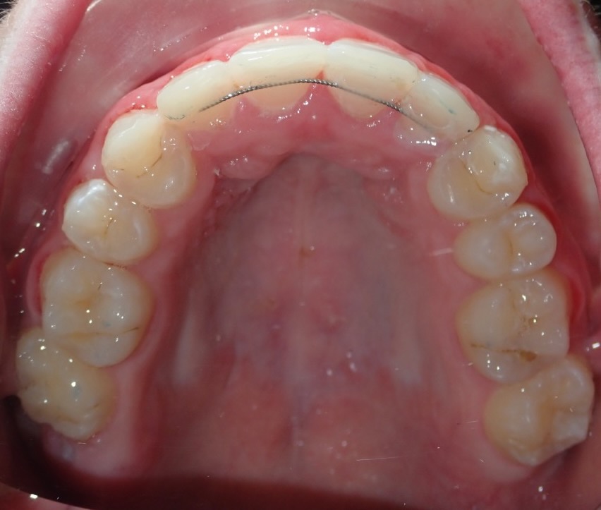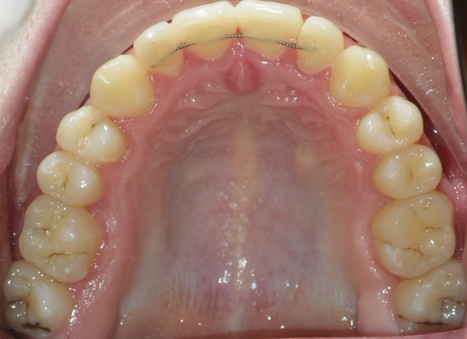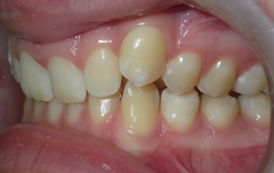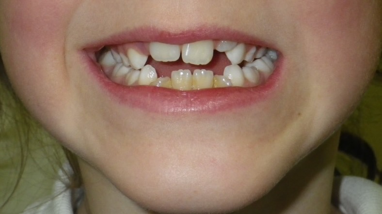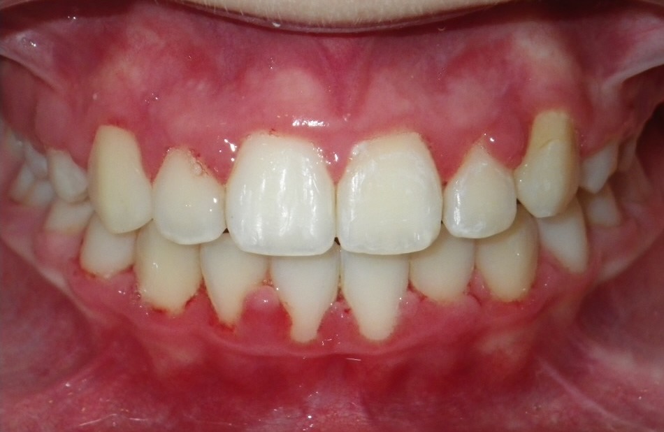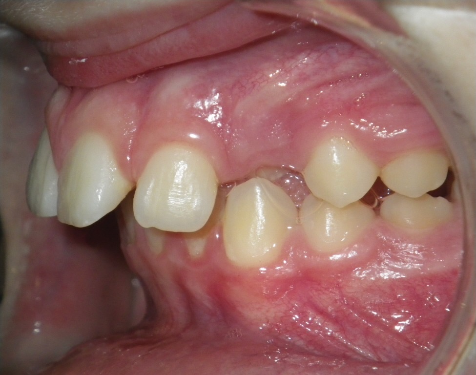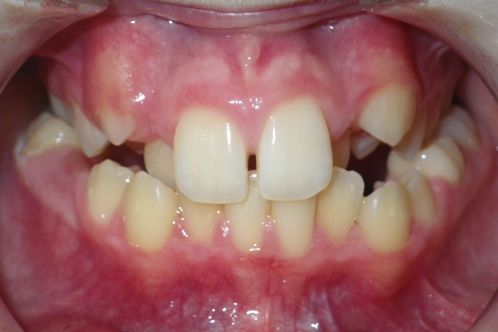 11 year old girl treated with expansion of the top jaw and upper and lower fixed braces. The treatment aimed to bring the upper canine teeth into the lateral incisor position due to congenitally missing upper lateral incisors. The upper canines were then masked to resemble upper lateral incisors. The total treatment time was 26 months.