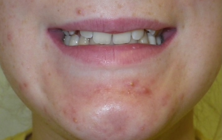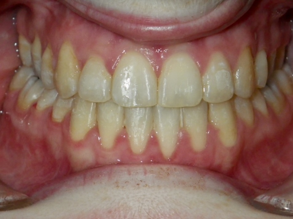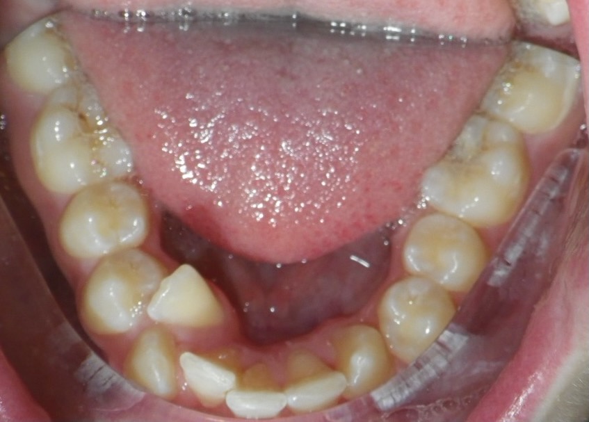 15-year-old girl with a congenitally missing lower front tooth and severe crowding of her upper and lower teeth. Her treatment involved extracting four premolar teeth and using upper and lower fixed braces over a period of 24 months.